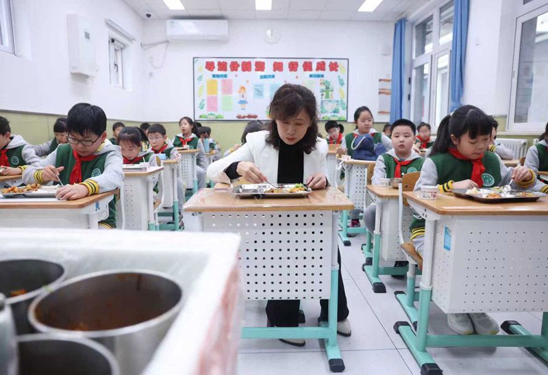 3月2日中午,鸦儿胡同小学教室,鸦儿胡同小学执行校长秦历红与小学生一同品尝“开学第一餐”。