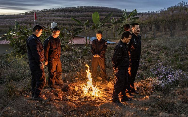 1月3日傍晚,山区湿冷,执勤民辅警在执勤点外集中烤火取暖,抵御山间低温。