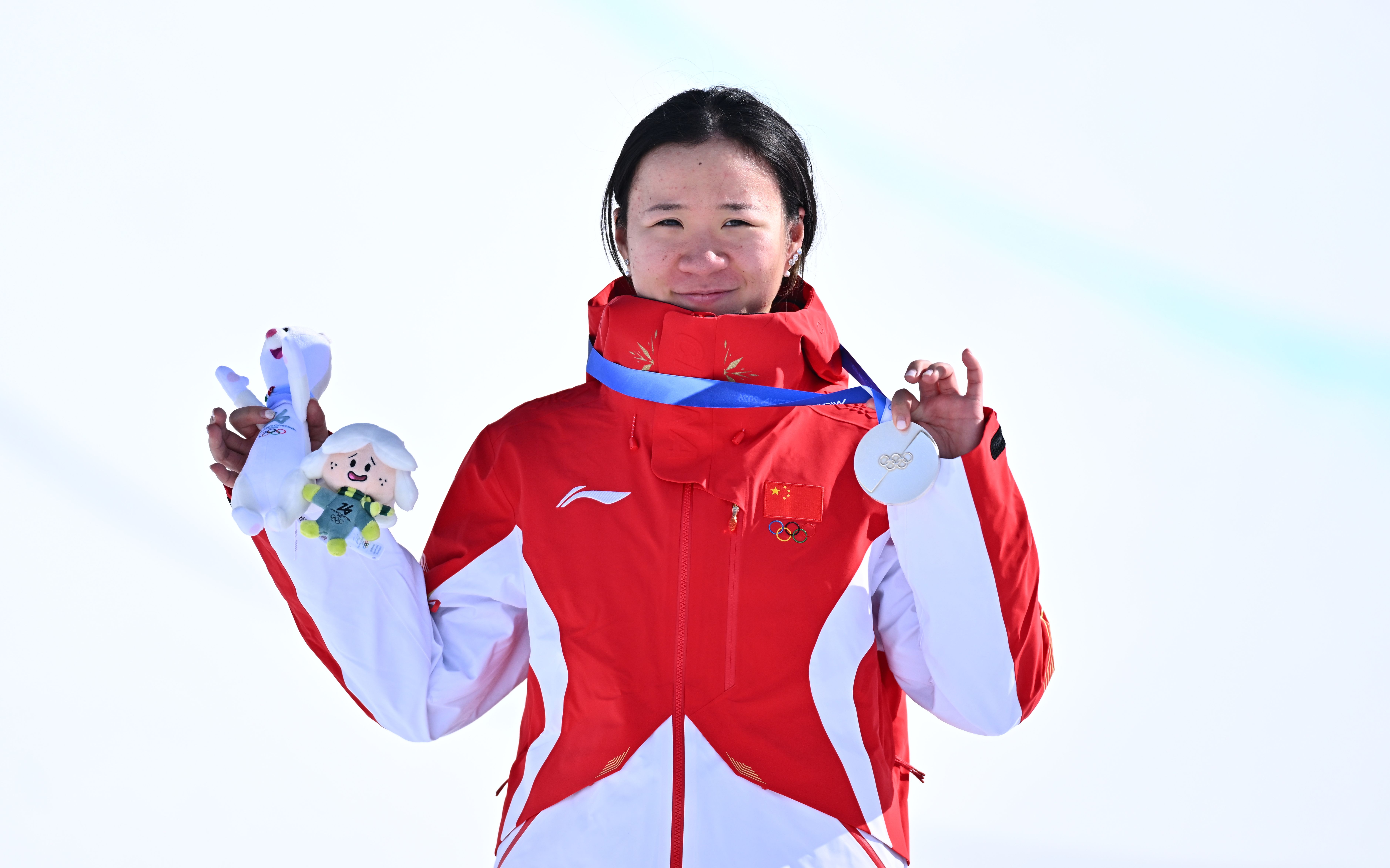 当地时间2月22日,亚军中国选手李方慧在颁奖仪式上。图/新华社