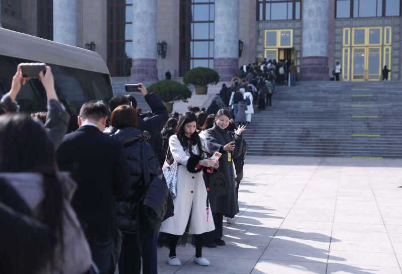 3月3日下午,参加全国政协十四届四次会议新闻发布会的记者在人民大会堂外排起长队。