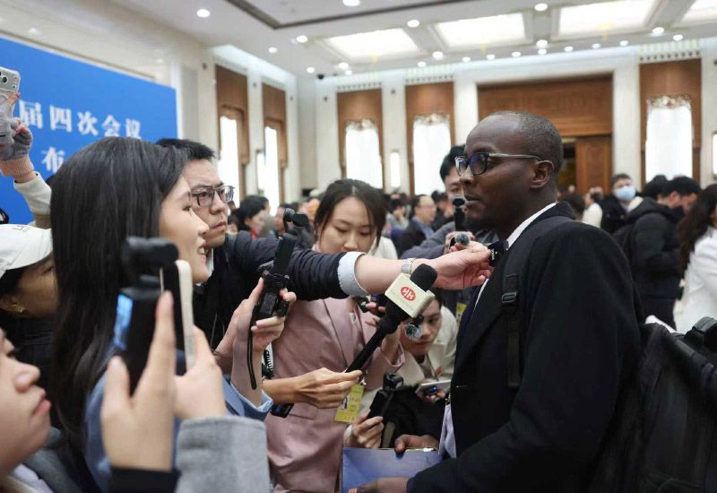 发布会后,几内亚视觉网记者巴尔德接受同行采访。