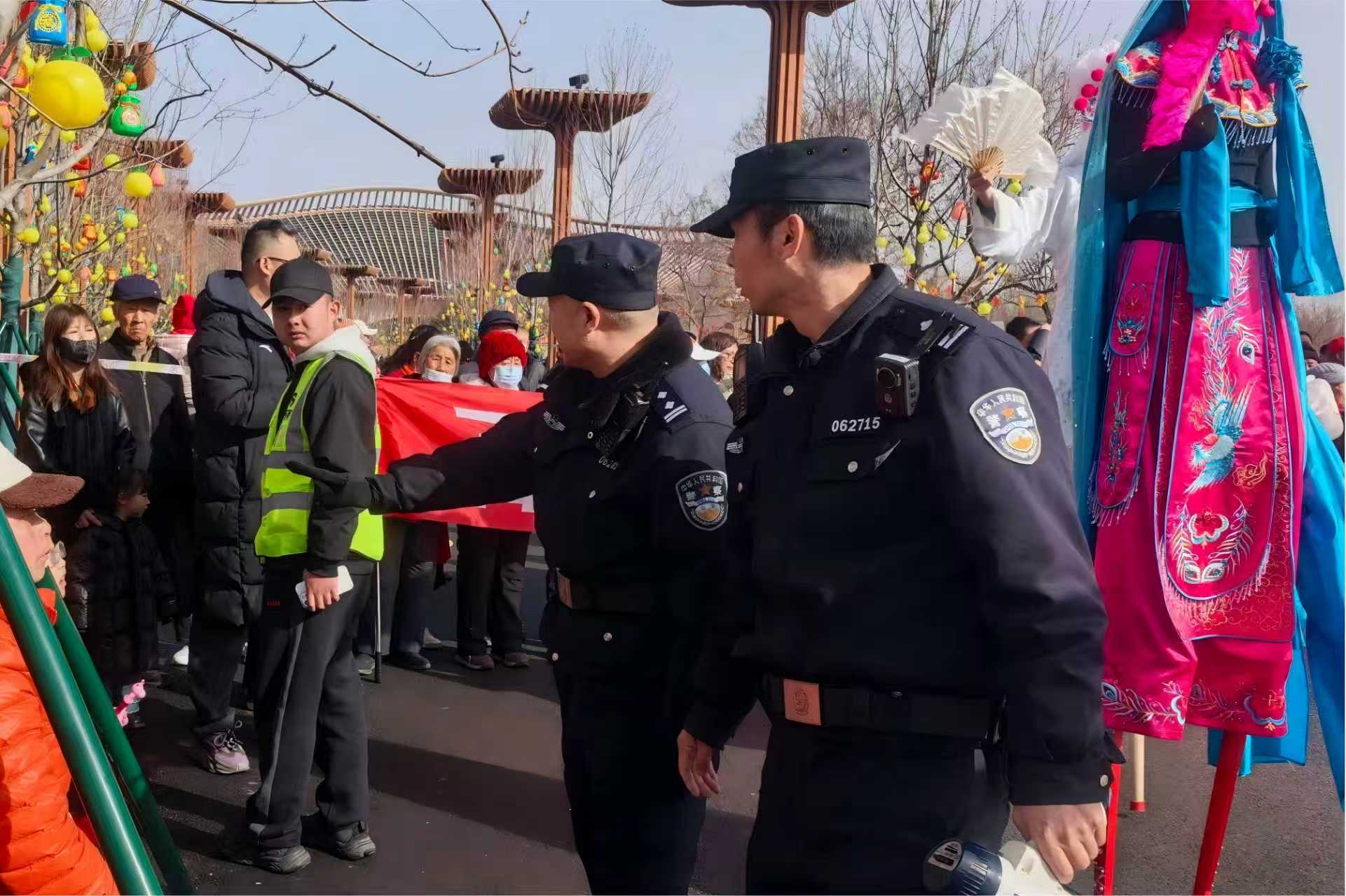 上午10时,花会展演正式开始,世园公园内锣鼓喧天、热闹非凡,延庆警方执勤警力早已提前到岗到位,开启“守护模式”。在各展演点位,民警们坚守岗位,有序引导观众文明观演,及时疏导密集人流,提醒市民注意脚下安全,避免拥挤;在公园出入口和周边道路,交管警力全力做好交通疏导,耐心解答市民咨询,引导车辆有序停放,保障现场及周边交通畅通。