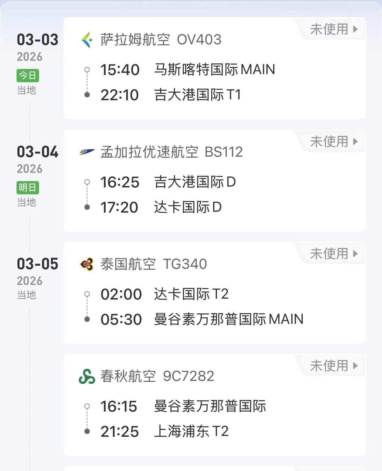 但最怕突如其来的变故。3月2日,邓野收到通知,飞往孟买的航班不知为何被取消,她不得不重新规划路线。最终,她又购买了3月3日由阿曼飞往达卡的航班。