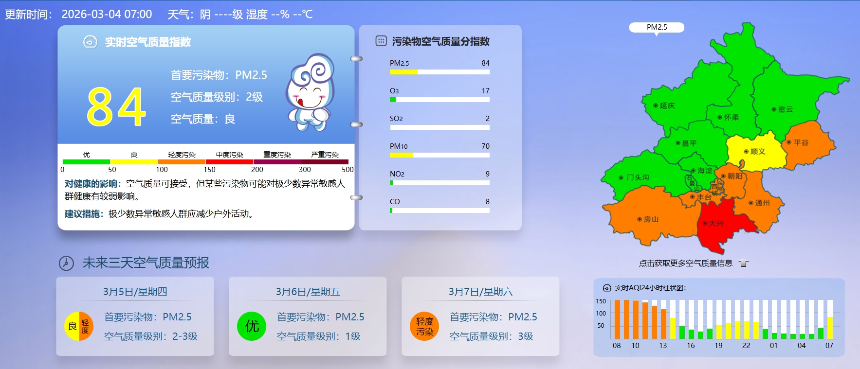 据北京市生态环境监测中心今早7时数据,目前实时空气质量指数84,空气质量良。