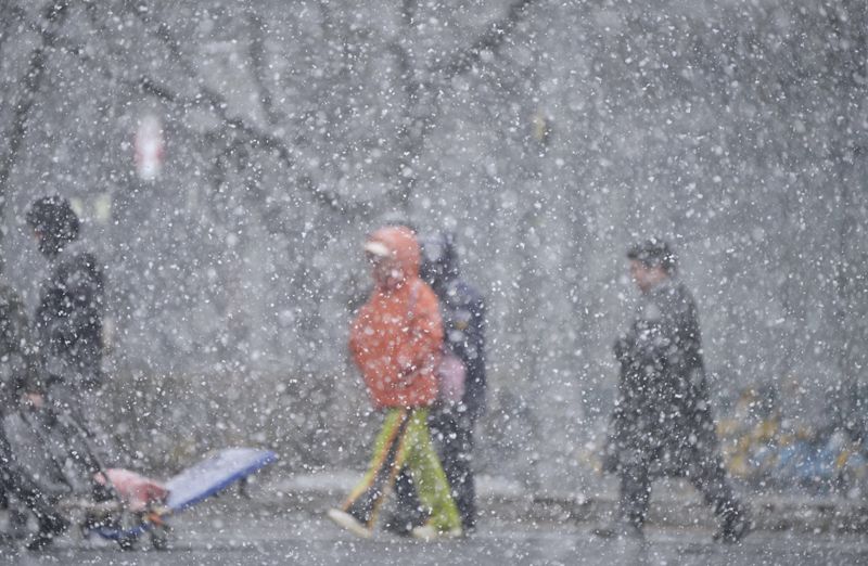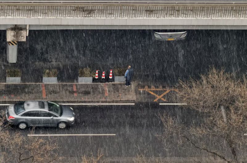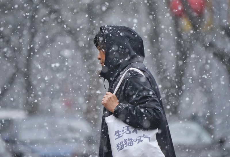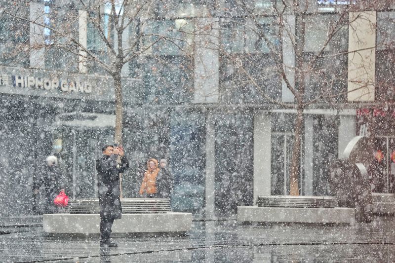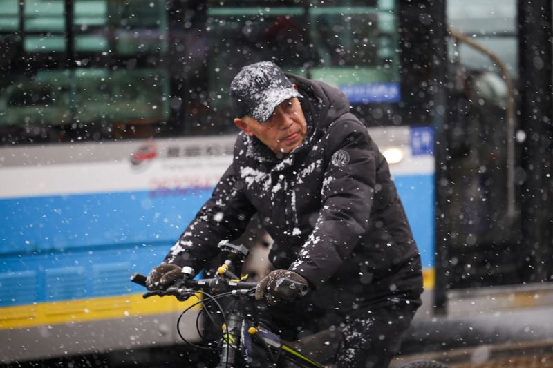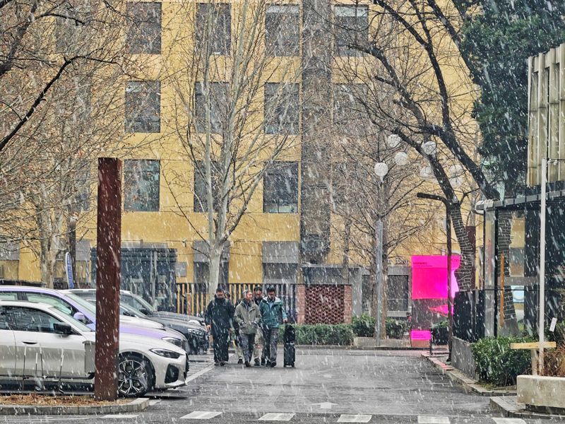 3月4日,团结湖,市民冒雪出行。北京市气象台4日11时发布,今天下午阴有雨夹雪或雪,偏东风二三级,最高气温2℃;夜间阴有小雪(山区有中雪),偏东风一二级,最低气温-2℃。降雪导致路面湿滑,能见度下降,已发布道路黄色结冰预警信号,外出注意防雪防滑和行车安全。