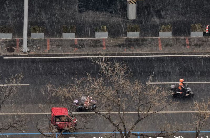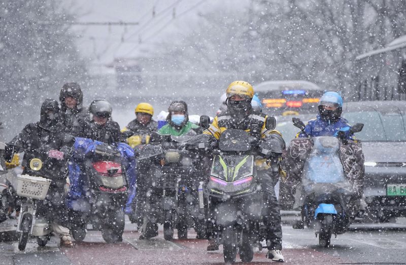 3月4日,朝阳路,外卖小哥们雪中送货。