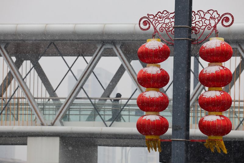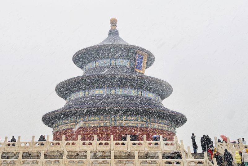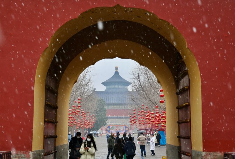 京城迎瑞雪:红墙映雪古韵浓,冒雪前行烟火忙