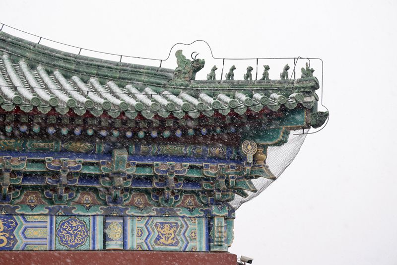 3月4日,天坛,屋脊瑞兽披雪,古韵盎然。