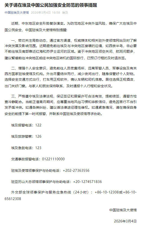 新京报讯 据中国驻埃及大使馆消息,近期,中东地区安全形势复杂演变。为防范地区冲突外溢风险,确保广大在埃及中国公民安全,中国驻埃及大使馆特别提醒: