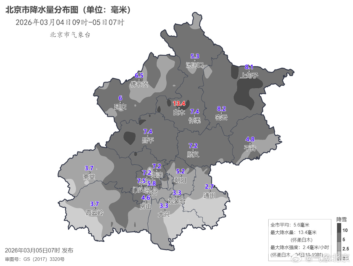 据气象部门统计,3月4日9时至3月5日7时,全市平均降雪量为5.6毫米,城区平均5.3毫米,最大降雪量出现在怀柔白木,为13.4毫米。西部、北部地区积雪深度2~7厘米,城区及平原大部地区积雪深度1~3厘米。