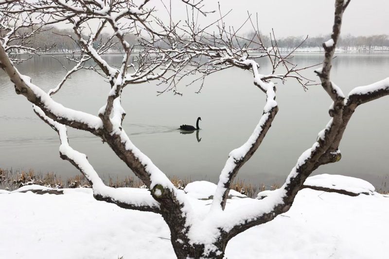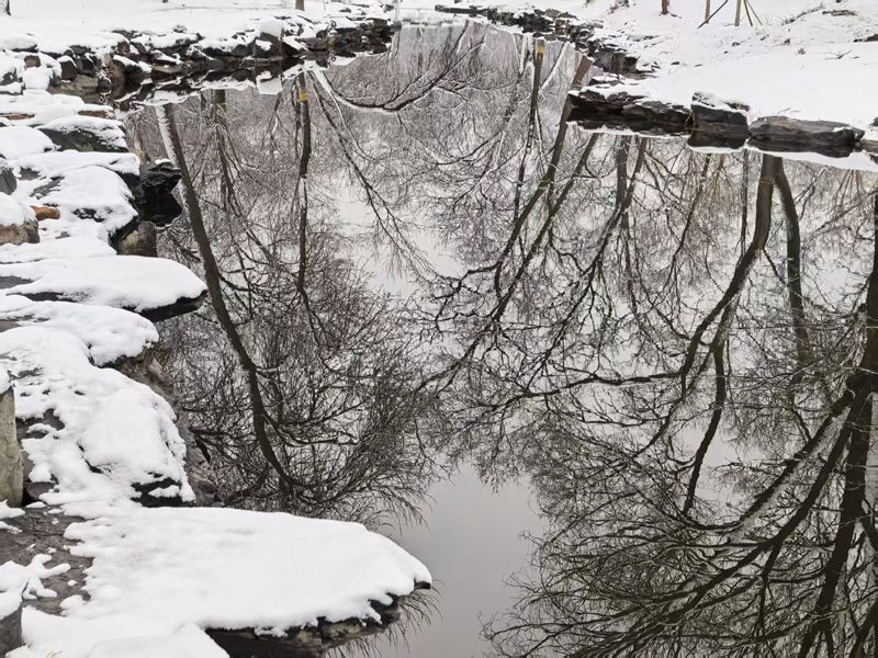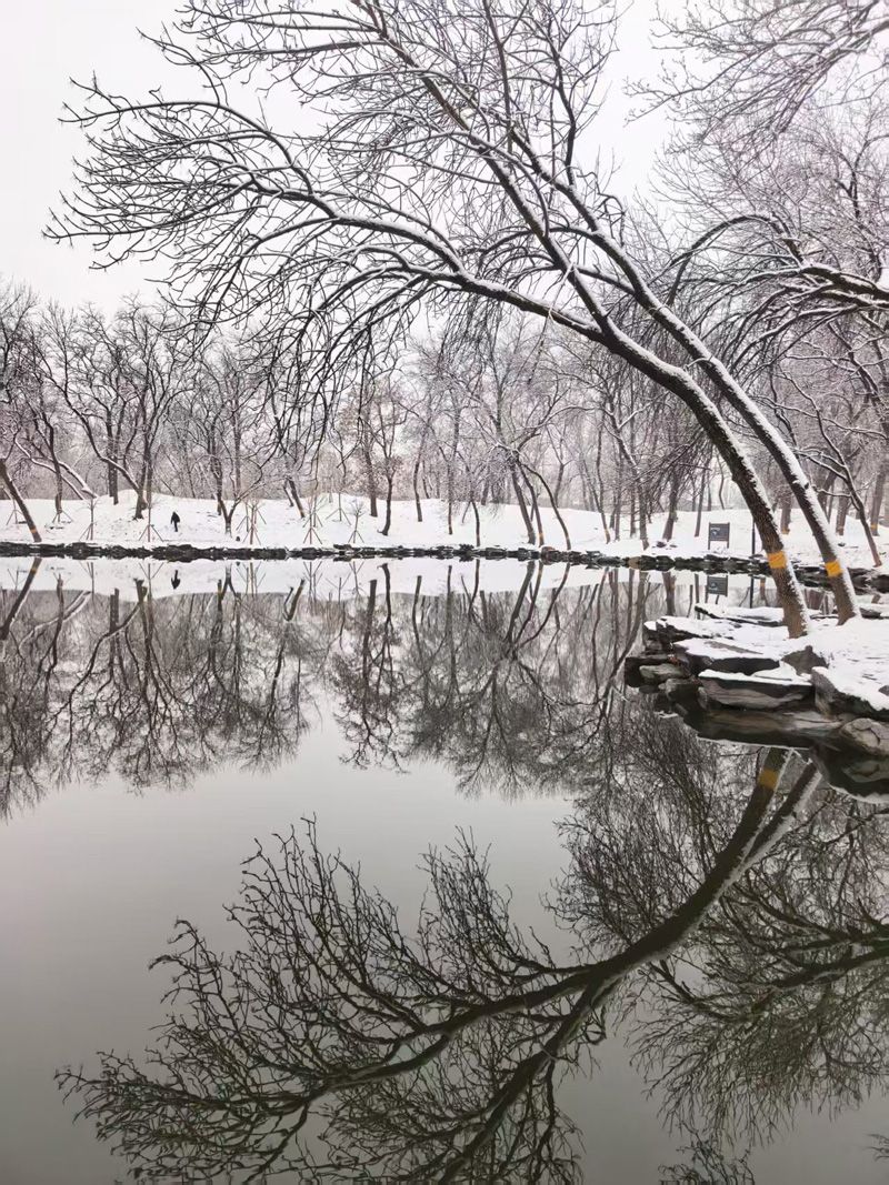 3月5日,雪后圆明园,一步一景皆成水墨长卷,游人漫步其间,如在画中行。