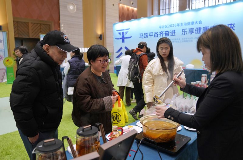 3月5日,平谷区2026年主动健康大会在北京金海湖国际会展中心举办。图为与会嘉宾参观营养食品展台。