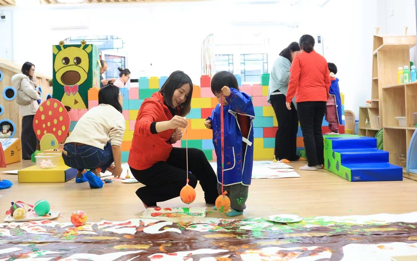 两岁多的男孩儿淘淘(化名)适应得不错,一进门就被气球作画吸引了,专心致志地拎着气球边走边“创作”。另一边,两岁半的苗苗(化名)正在游戏屋里探索各种积木玩具。
