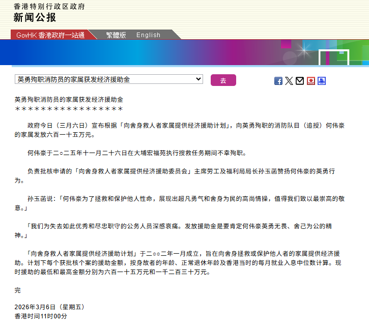 新京报讯 据香港特区政府新闻网消息,3月6日,香港特区政府发布新闻公报。公报提到,政府根据一项经济援助计划,向英勇殉职的消防队员何伟豪的家属发放615万元经济援助金。