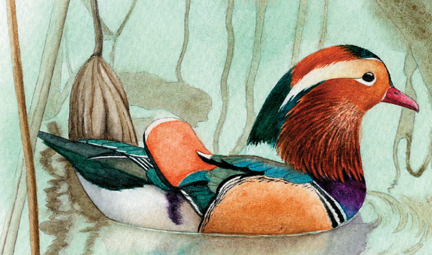 鸳鸯是一种漂亮的水鸟,属于雁形目鸭科,广泛分布于中国除新疆、西藏和青海之外的大部分区域。鸳鸯雄鸟羽毛艳丽,翅上有棕黄色装饰性帆状饰羽,雌鸟的颜色则相对暗淡。鸳鸯在求偶期多是一雄一雌活动,常常一起追逐飞行。雄鸟会紧紧跟在雌鸟身后,偶尔也会喂雌鸟小鱼以献殷勤。雄鸟和雌鸟亦常在一起相互梳理羽毛,看起来非常亲密。这被认为是古人把鸳鸯视为爱情象征的主要原因。