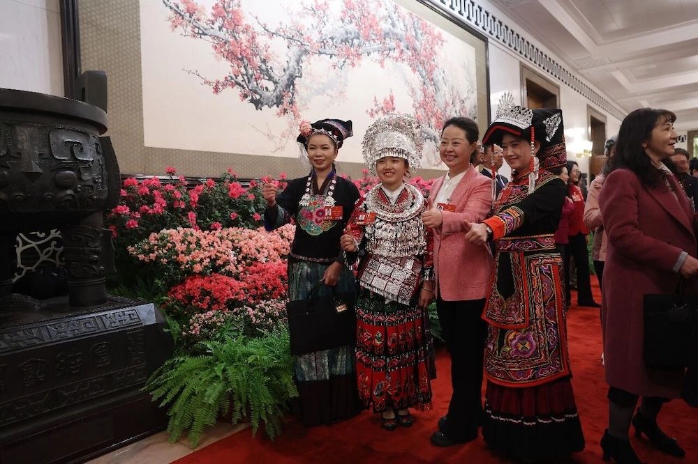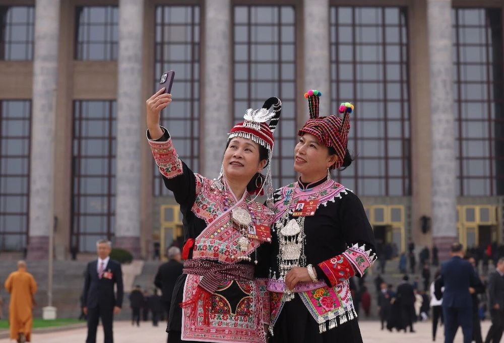 3月5日,人民大会堂,十四届全国人大四次会议开幕会前,少数民族代表在会场外合影。