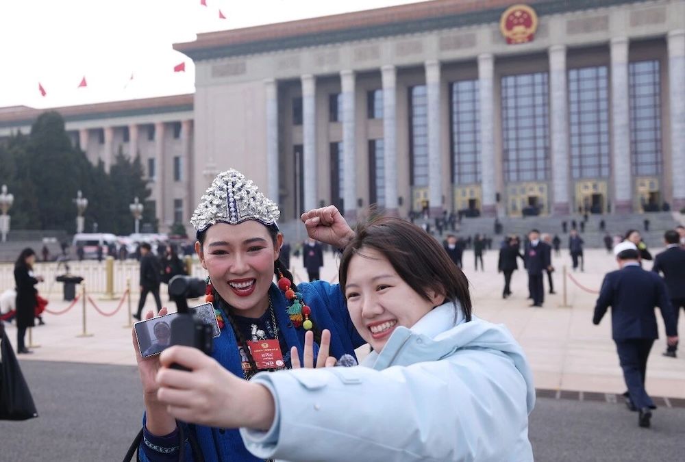 3月7日,两名少数民族女政协委员在人民大会堂前合影。