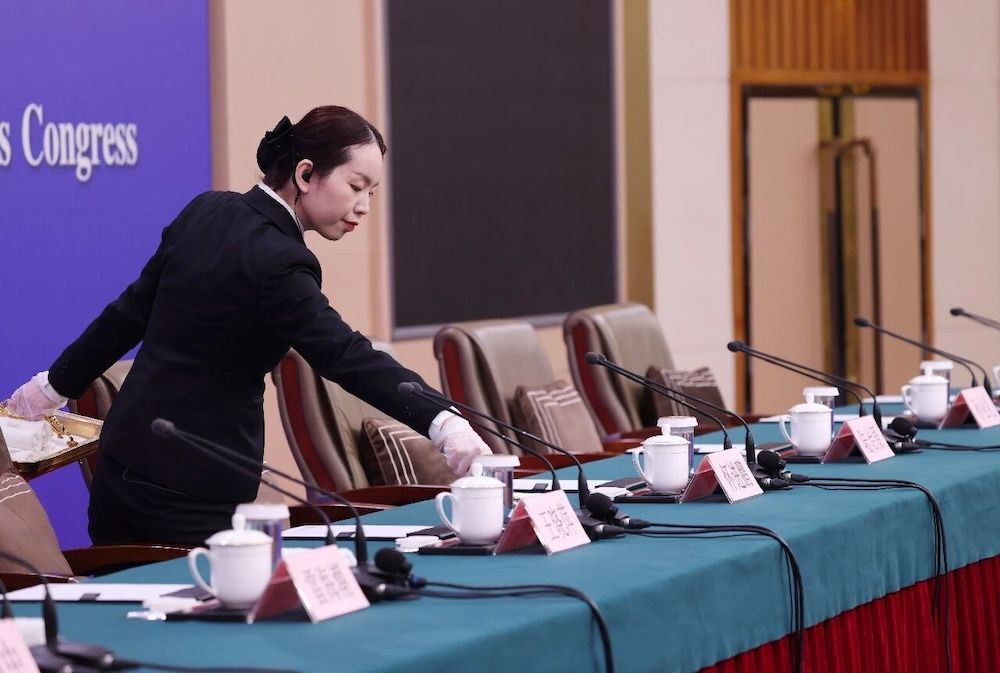 3月7日,十四届全国人大四次会议民生主题记者会在梅地亚中心新闻发布厅举行。记者会前,一名两会服务保障工作人员精心布置会场。
