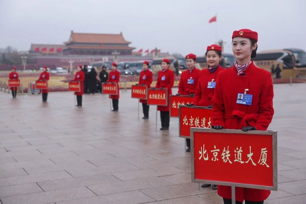 3月4日,天安门广场,两会服务保障人员手持引导牌等待会议结束。