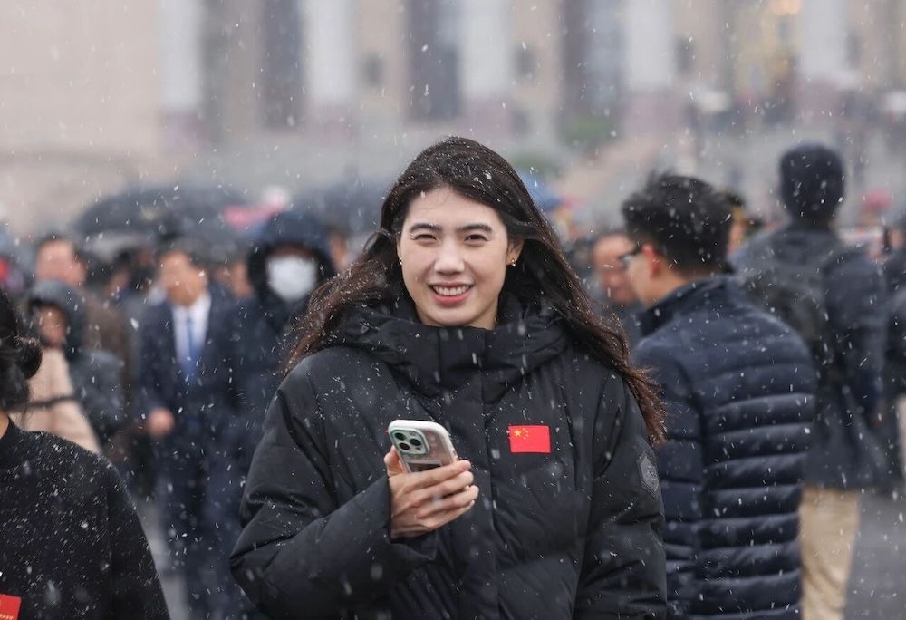 3月4日,参加十四届全国人大四次会议预备会的全国人大代表张雨霏走在瑞雪中。
