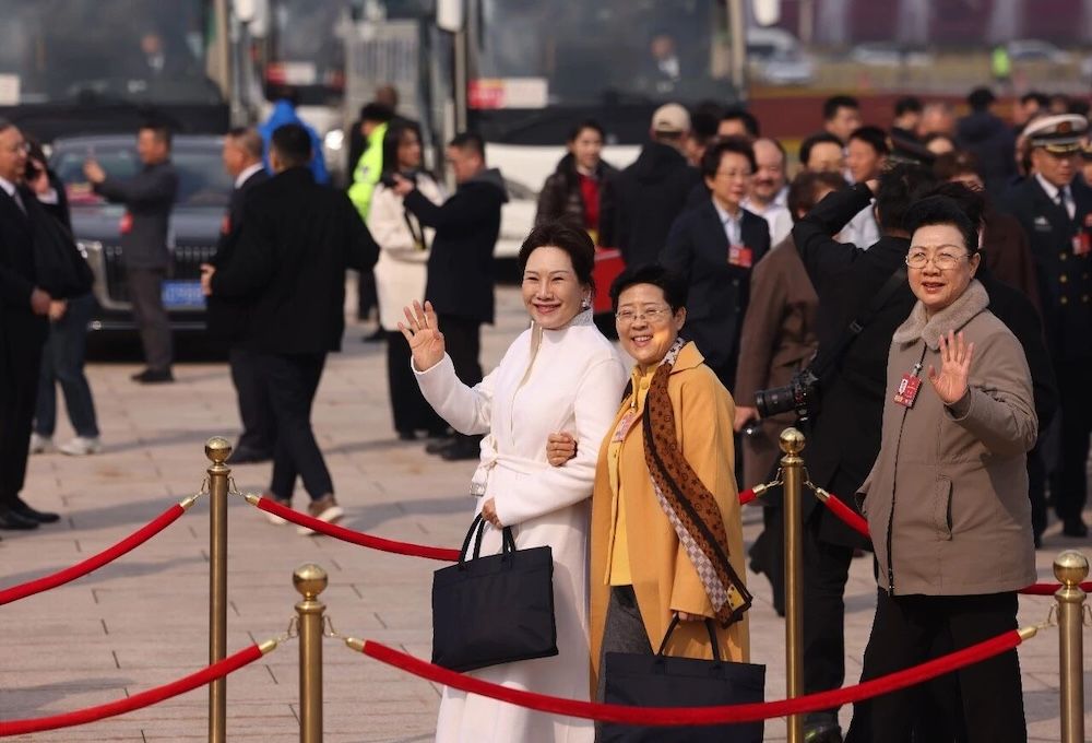 3月7日,天安门广场,参加全国政协十四届四次会议第二次全体会议的女政协委员向记者挥手致意。