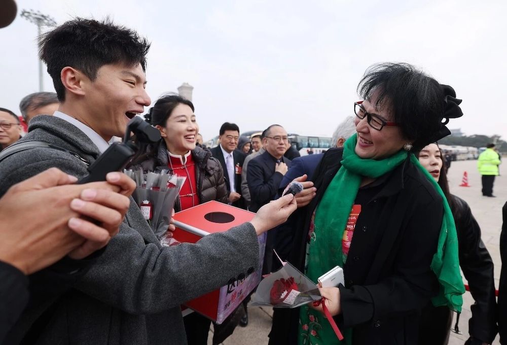 3月7日,天安门广场,全国政协十四届四次会议第二次全体会议前,一名女政协委员接受媒体赠送的鲜花并接受采访。