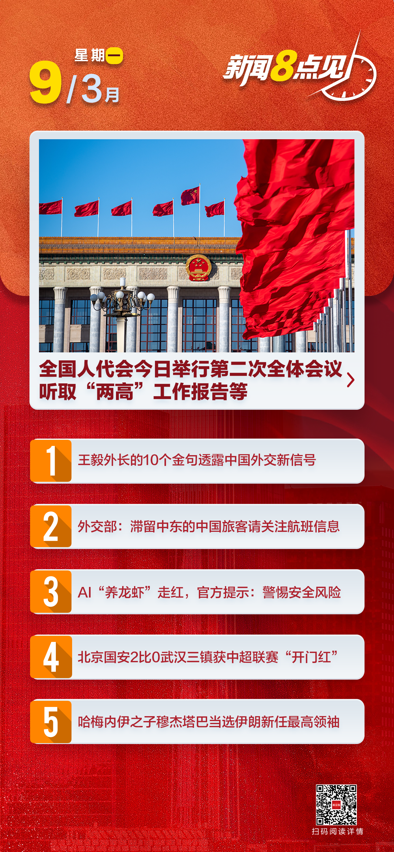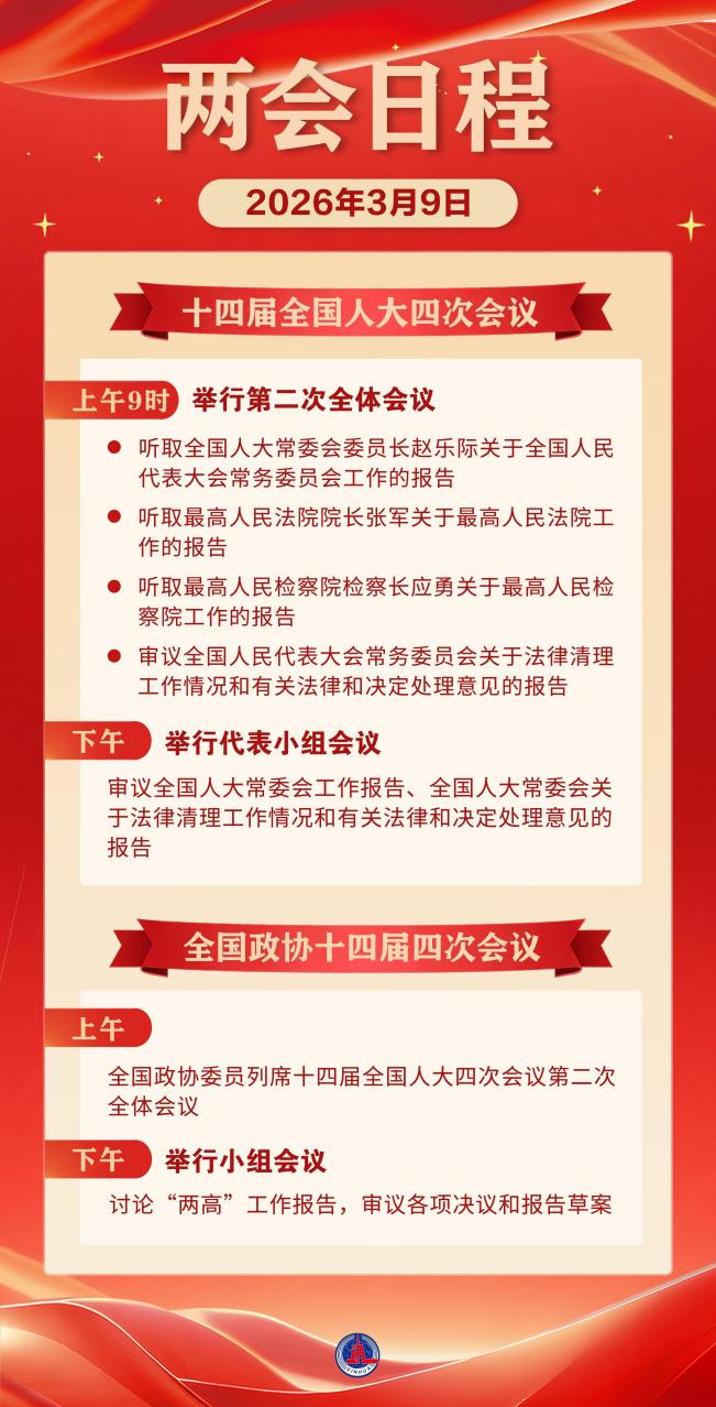 两会日程预告|3月9日:全国人代会举行第二次全体会议 听取全国人大常委会工作报告和“两高”工作报告