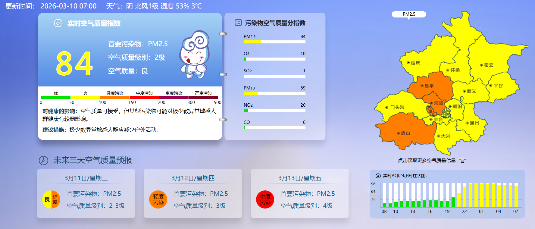 据北京市生态环境监测中心今早7时数据,目前实时空气质量指数84,空气质量良。