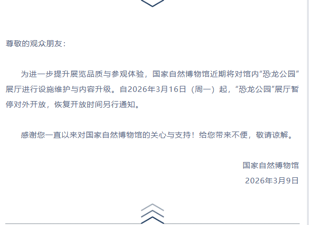 据国家自然博物馆微信公众号消息,为进一步提升展览品质与参观体验,国家自然博物馆近期将对馆内“恐龙公园”展厅进行设施维护与内容升级。自2026年3月16日(周一)起,“恐龙公园”展厅暂停对外开放,恢复开放时间另行通知。