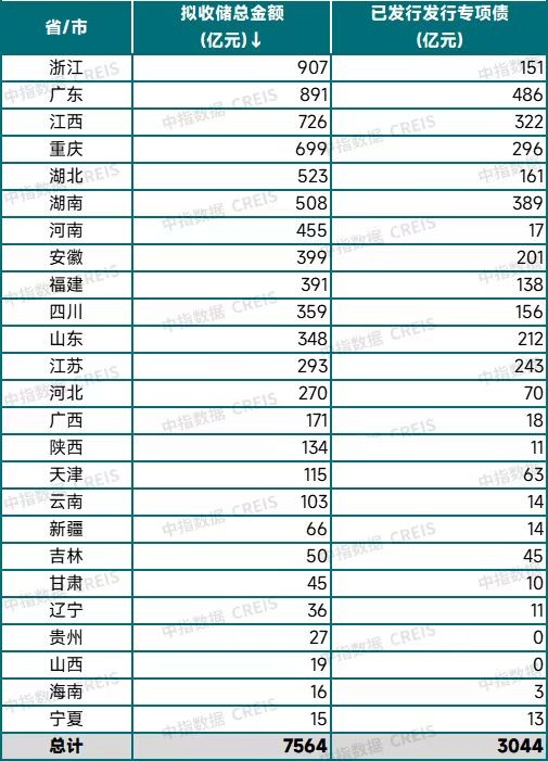 自2024年11月,自然资源部发布运用地方政府专项债券资金收回收购存量闲置土地的通知之后,专项债收储土地政策实施已有一年多。根据中指研究院统计,2025年全国各地公示拟使用专项债收回收购存量闲置土地的数量超5500宗,总金额超7500亿元。