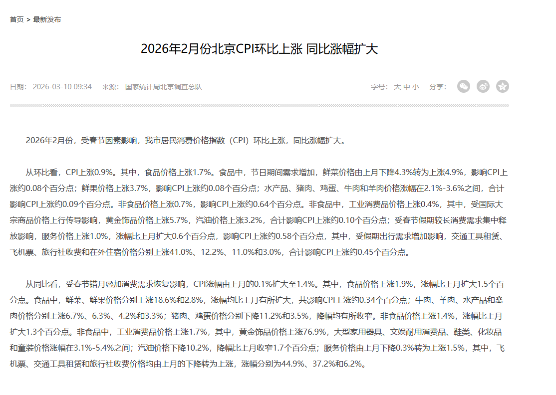 新京报讯 据国家统计局北京调查总队消息,2026年2月份,受春节因素影响,我市居民消费价格指数(CPI)环比上涨,同比涨幅扩大。