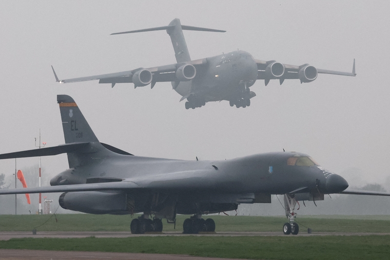 ▲当地时间2026年3月8日,英国费尔福德,在美国与以色列同伊朗冲突期间,一架美国空军C-17A运输机降落在费尔福德空军基地跑道旁停放的B-1B轰炸机后方。图/IC photo