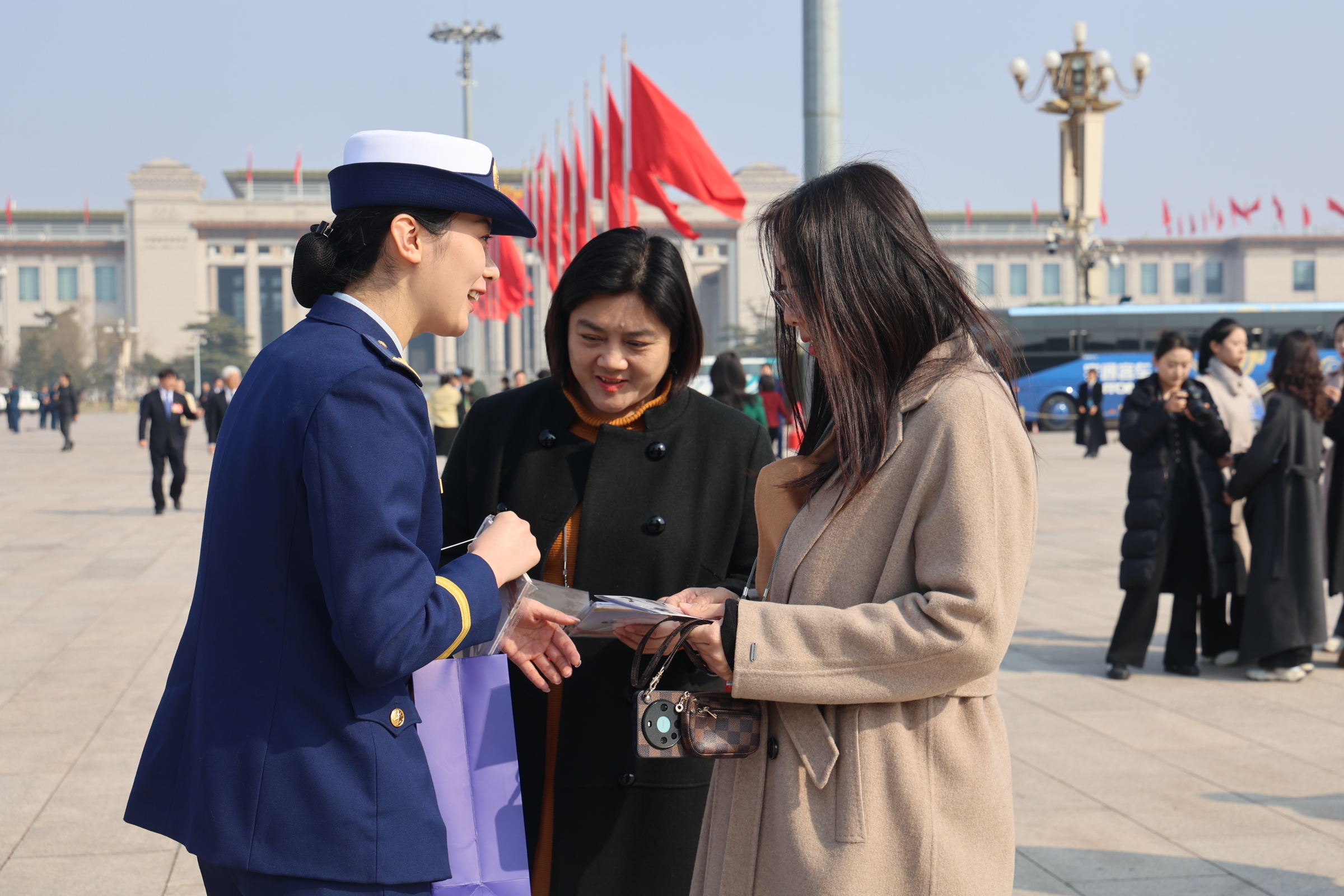 活动现场,支队女指战员们在天安门广场有序开展宣传活动。大家将支队定制的特色消防宣传品送到广场上的女性人员手中,结合首都核心区域的消防安全特点,用简洁通俗的语言讲解日常防火要点、初期火灾扑救、火场应急处置等关键知识,把贴心的平安叮嘱送到群众身边,呼吁大家时刻绷紧消防安全弦,提升自防自救能力,共同筑牢城市安全防线。