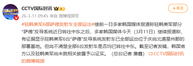 据@CCTV国际时讯 消息,继前一日多家韩国媒体报道称驻韩美军部分“萨德”反导系统近日转往中东之后,多家韩国媒体今天(3月11日)继续报道称,有证据显示驻韩美军6台“萨德”反导系统发射车已全部运出位于庆尚北道星州郡的部署基地。但尚不清楚全部6台发射车是否均已转往中东。截至记者发稿,韩国官方以及驻韩美军尚未就相关披露予以证实。(总台记者 唐鑫)