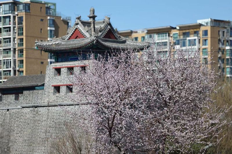 左安门角楼:山桃映古建