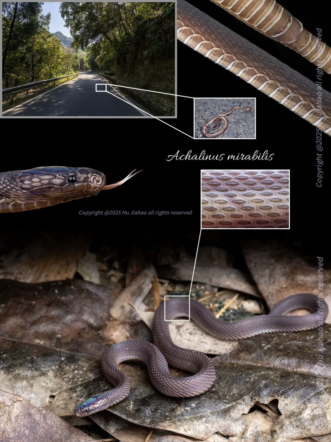 起初的一段时间里,胡家豪根据此前团队认为的大多数脊蛇喜好的中高海拔生境和湿润天气寻找,结果一无所获。直到在一个天气非常好的晚上,他抱着试试看的想法,在其他区域转了一转,竟然意外发现了这个物种的活体。此后根据新的经验,“胡家豪更加疯狂地前往括苍山进行寻找,最终总共寻找到了三条活体和两条路杀的尸体。随后,他对这些个体拍摄了高分辨率的照片,并在调查团队的帮助下进行了初步的检视,同时将他所获得的全部信息汇总给我,开始正式参与到新物种的工作中来。”徐宇浩表示。