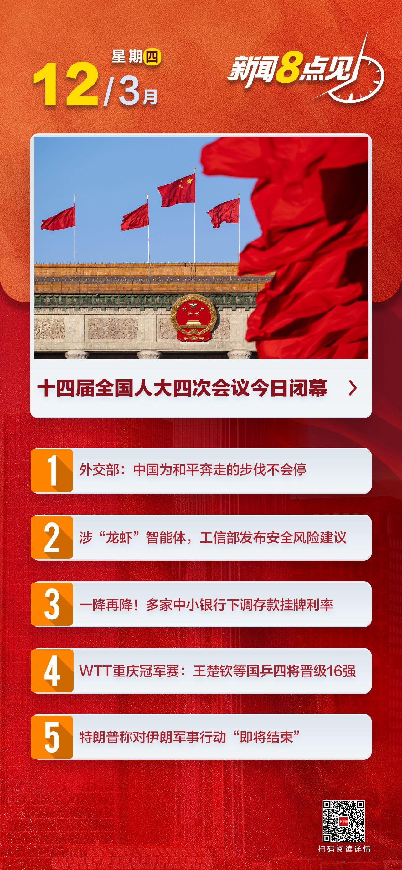 两会日程预告丨3月12日:十四届全国人大四次会议闭幕