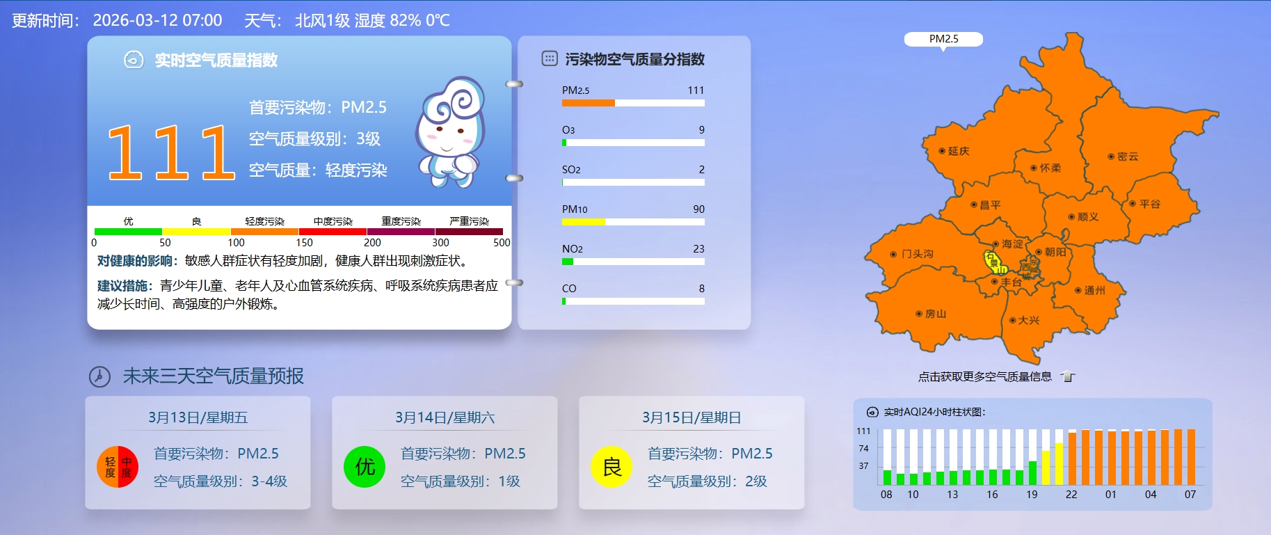 据北京市生态环境监测中心今早7时数据,目前实时空气质量指数111,空气质量轻度污染。