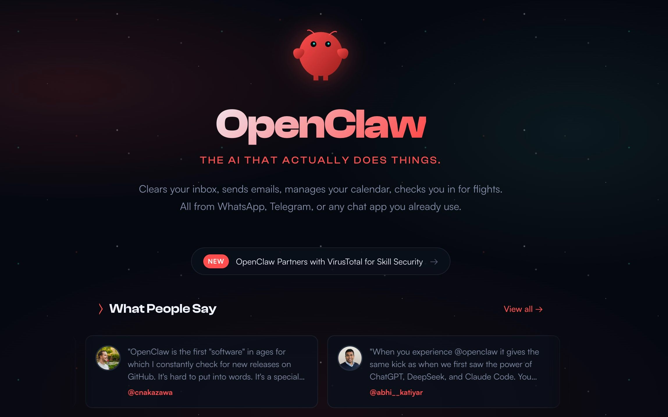 OpenClaw官网,它的图标是一只红彤彤的龙虾。图/OpenClaw官网截图
