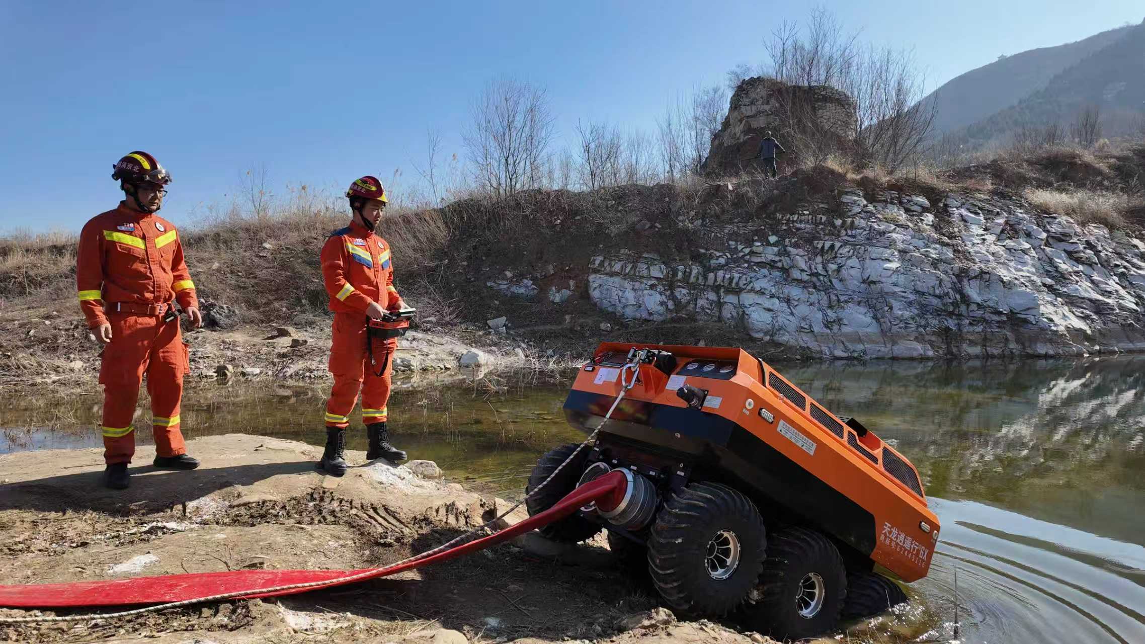 消防员操控全地形机器人在复杂水域远程抽水。房山消防供图