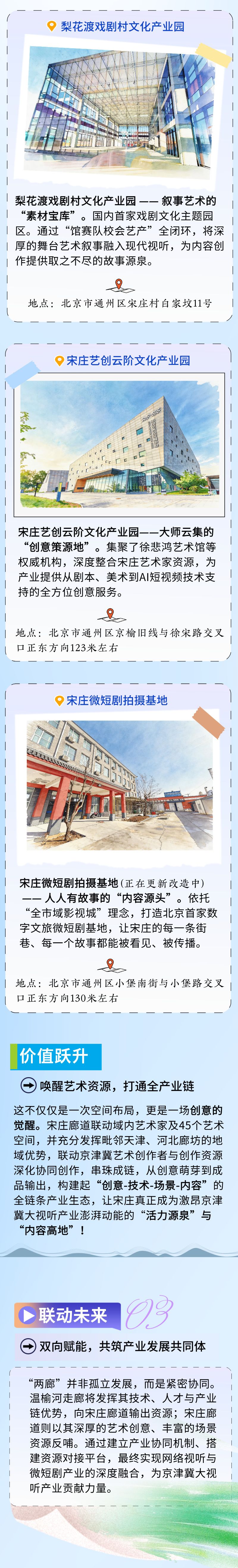 至此,宋庄新视听产业廊道以“京榆旧线”为轴,串联起宋庄微短剧拍摄基地、宋庄艺创云阶文化产业园、梨花渡戏剧村文化产业园、宋庄未来视听谷、东古里实景拍摄基地五大特色园区,形成“一轴串五园”的协同发展格局。