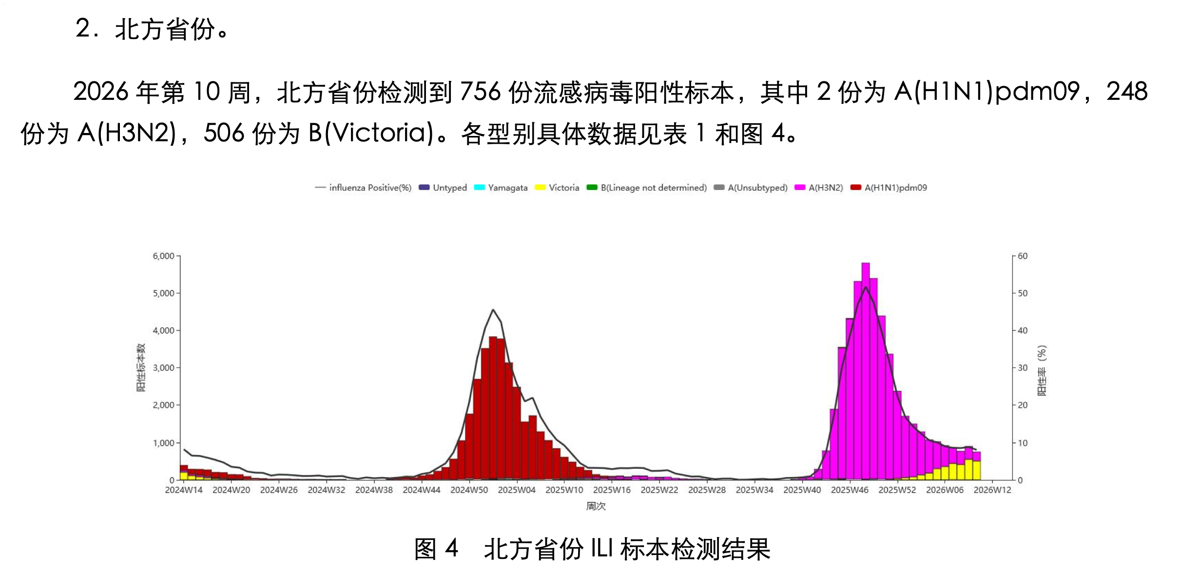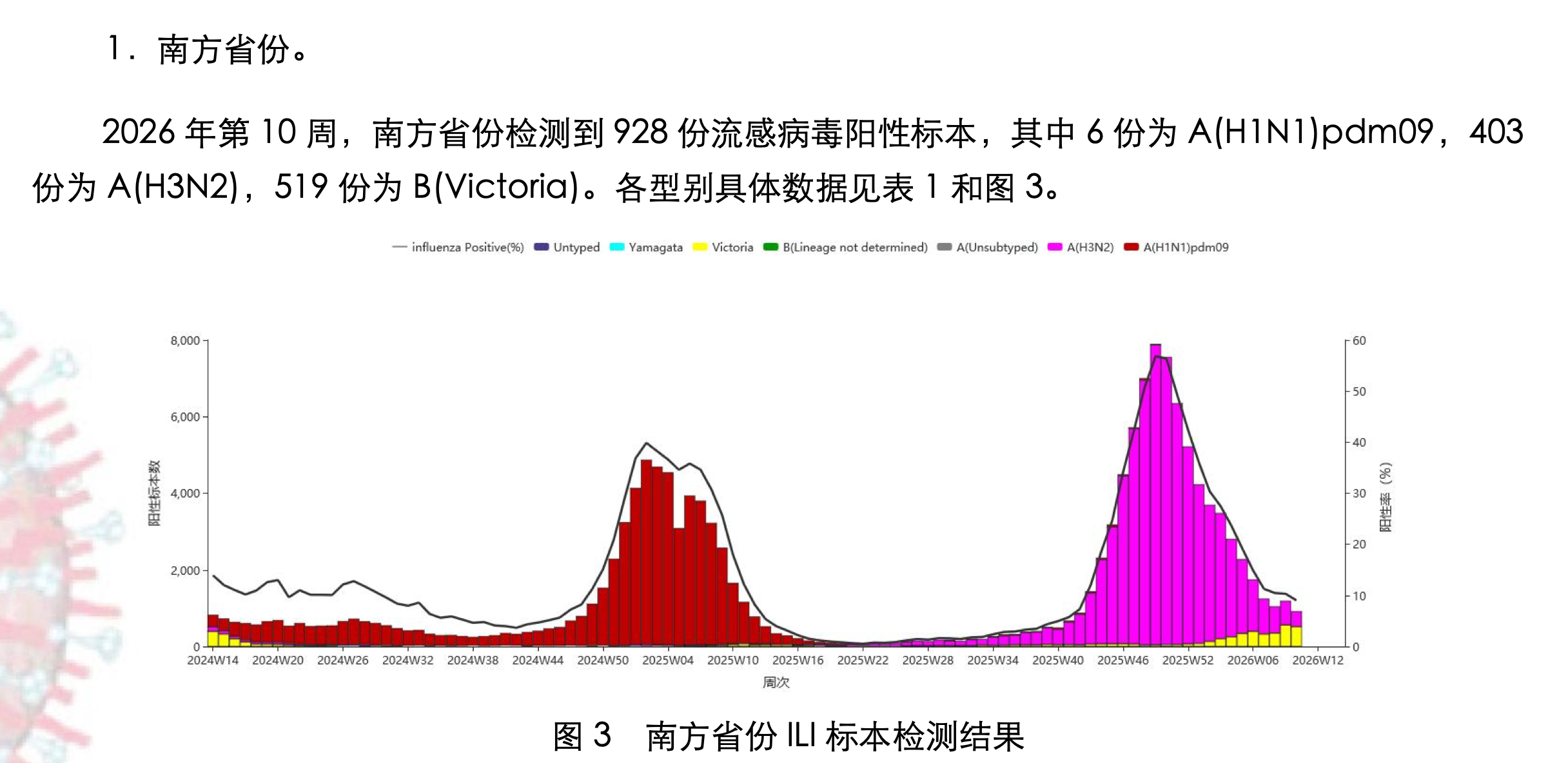 记者在流感监测周报中看到,2026年第10周,全国(未含港澳台地区)流感监测网络实验室共检测流感样病例监测标本19721份。南方省份检测到928份流感病毒阳性标本,其中6份为A(H1N1)pdm09,403份为A(H3N2),519份为B(Victoria)。北方省份检测到756份流感病毒阳性标本,其中2份为A(H1N1)pdm09,248份为A(H3N2),506份为B(Victoria)。