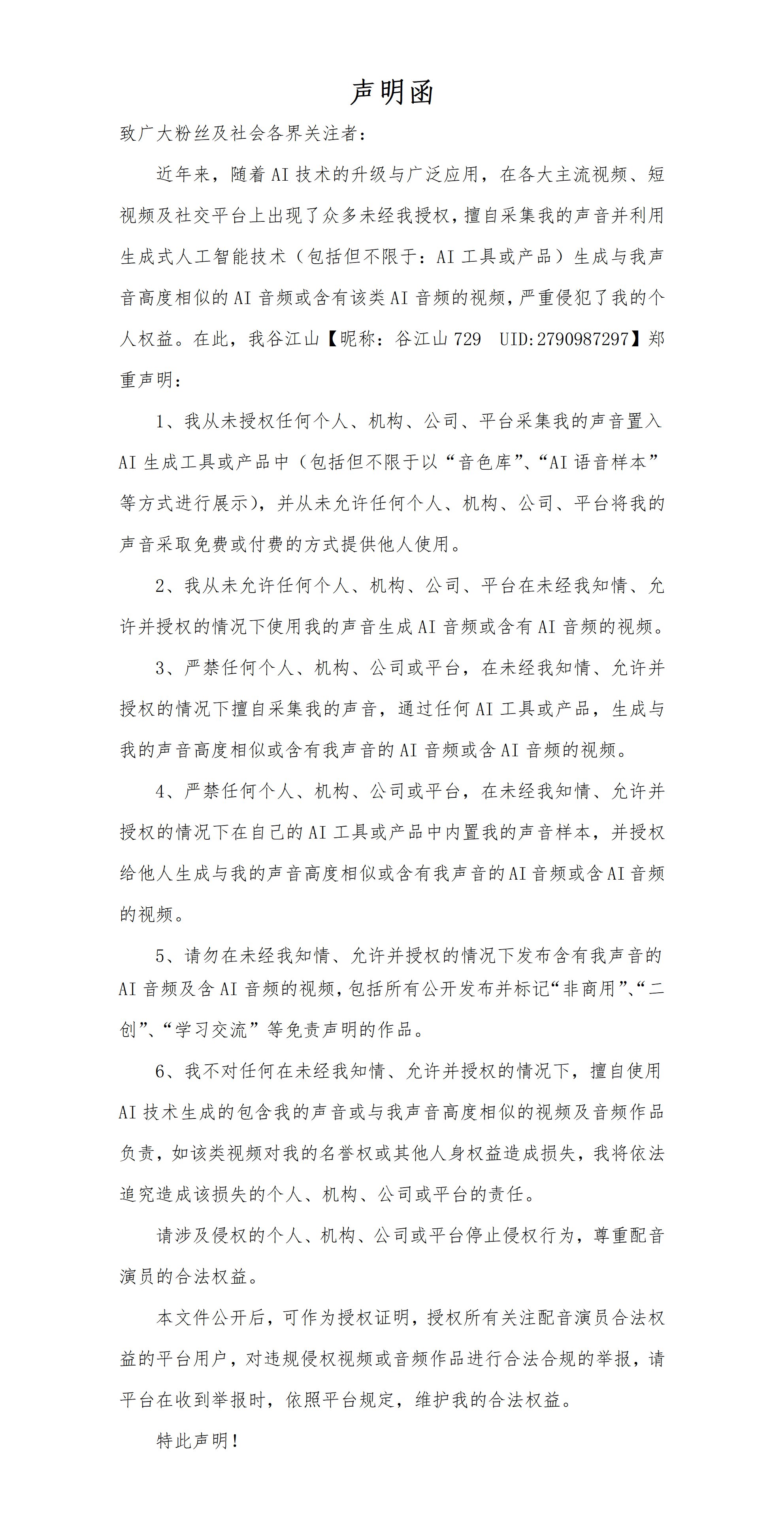 李振武:从法律性质上看,这份由众多配音演员联合发布的声明,是一份针对不特定多数人的、公开的“权利警告函”。其核心功能是公开宣告其对其声音享有法定的声音权益,同时也预先告知社会公众,特别是AI技术开发者、平台及用户,任何未经许可的特定使用行为均被权利人所禁止,这为后续可能的法律行动(如发送侵权通知、提起诉讼)奠定了事实和证据基础。