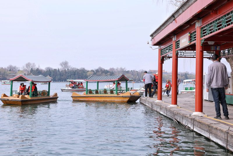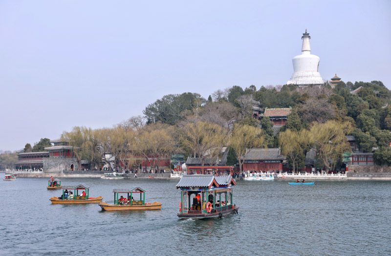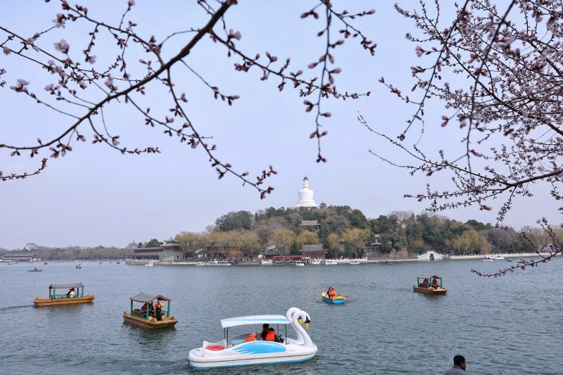 3月14日,北海公园,游船在湖面悠然穿行。今日起,颐和园、北海公园、陶然亭公园、紫竹院公园、玉渊潭公园五家市属公园游船同步开航。