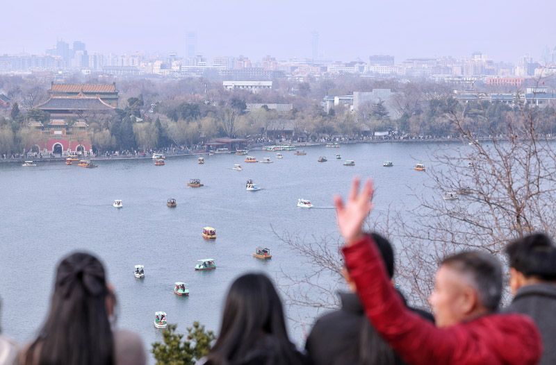 3月14日,北海公园,登上山顶的游客将一湖春色尽收眼底。