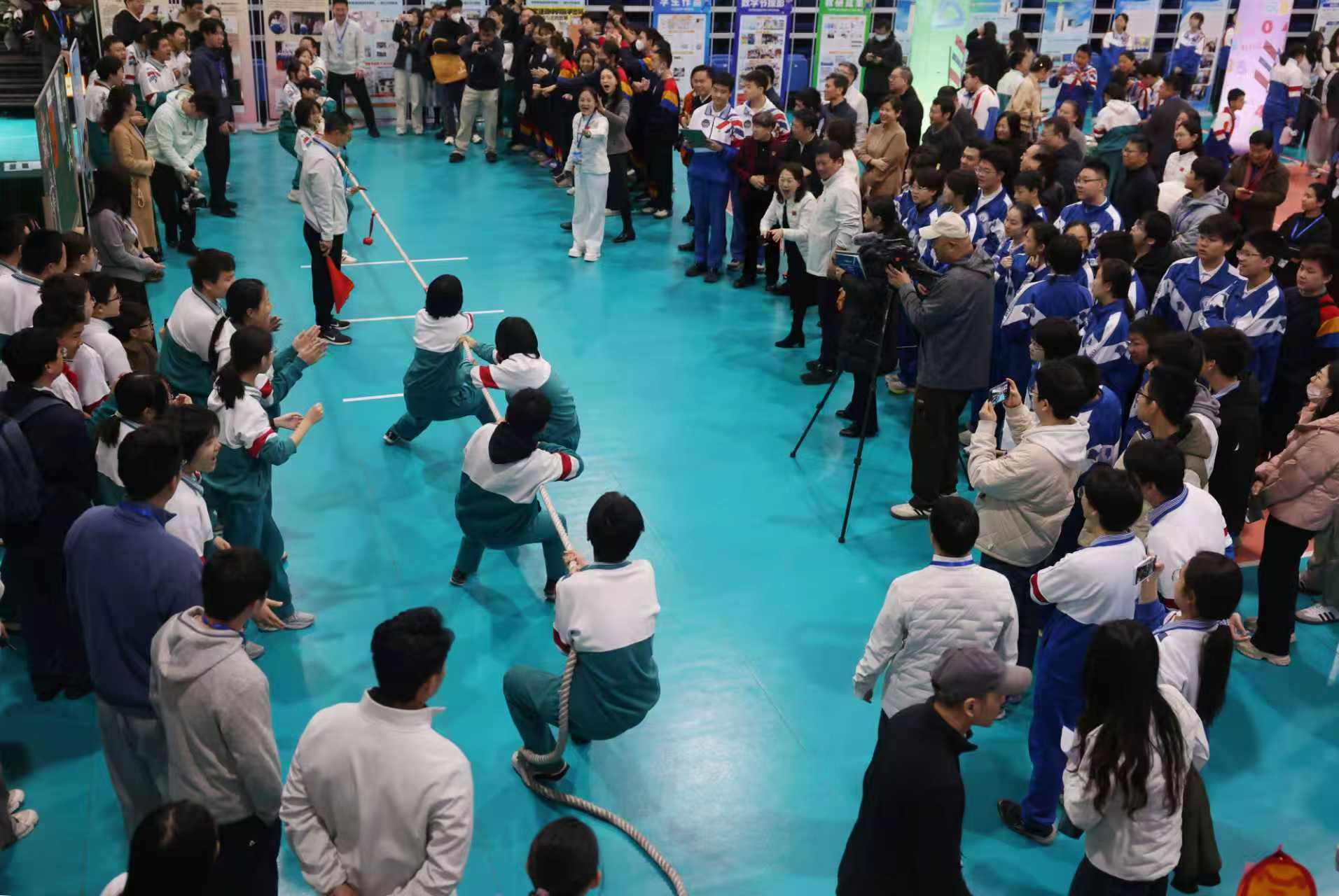 博弈拔河项目中,两队学生“排兵布阵”自行决定比赛对战人数,以获得最终胜利。新京报记者 李木易 摄