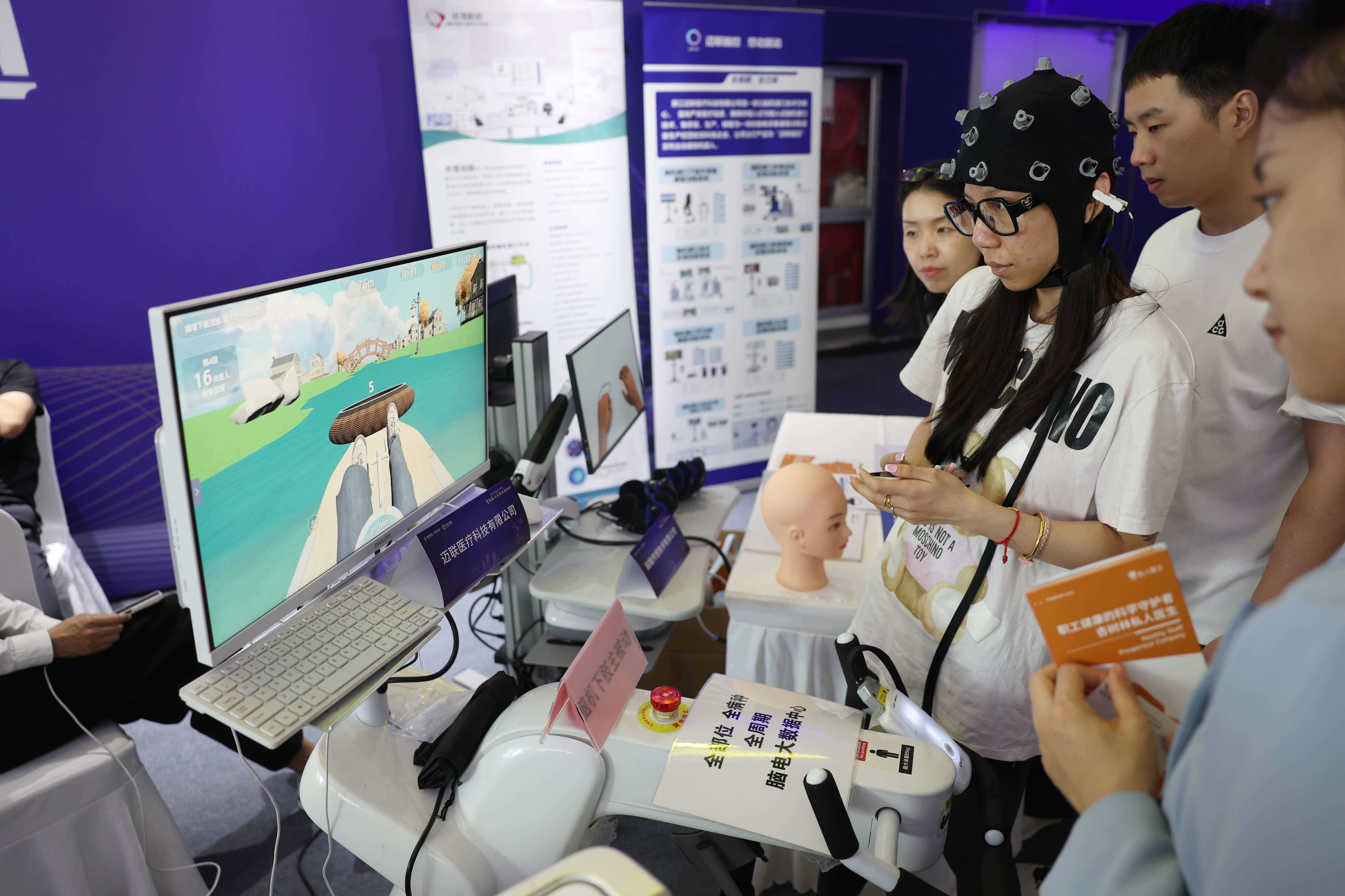 2025年6月26日,在丰台区举办的第二届智能医工产业创新发展大会上,工作人员演示脑机接口设备。新京报记者 陶冉 摄