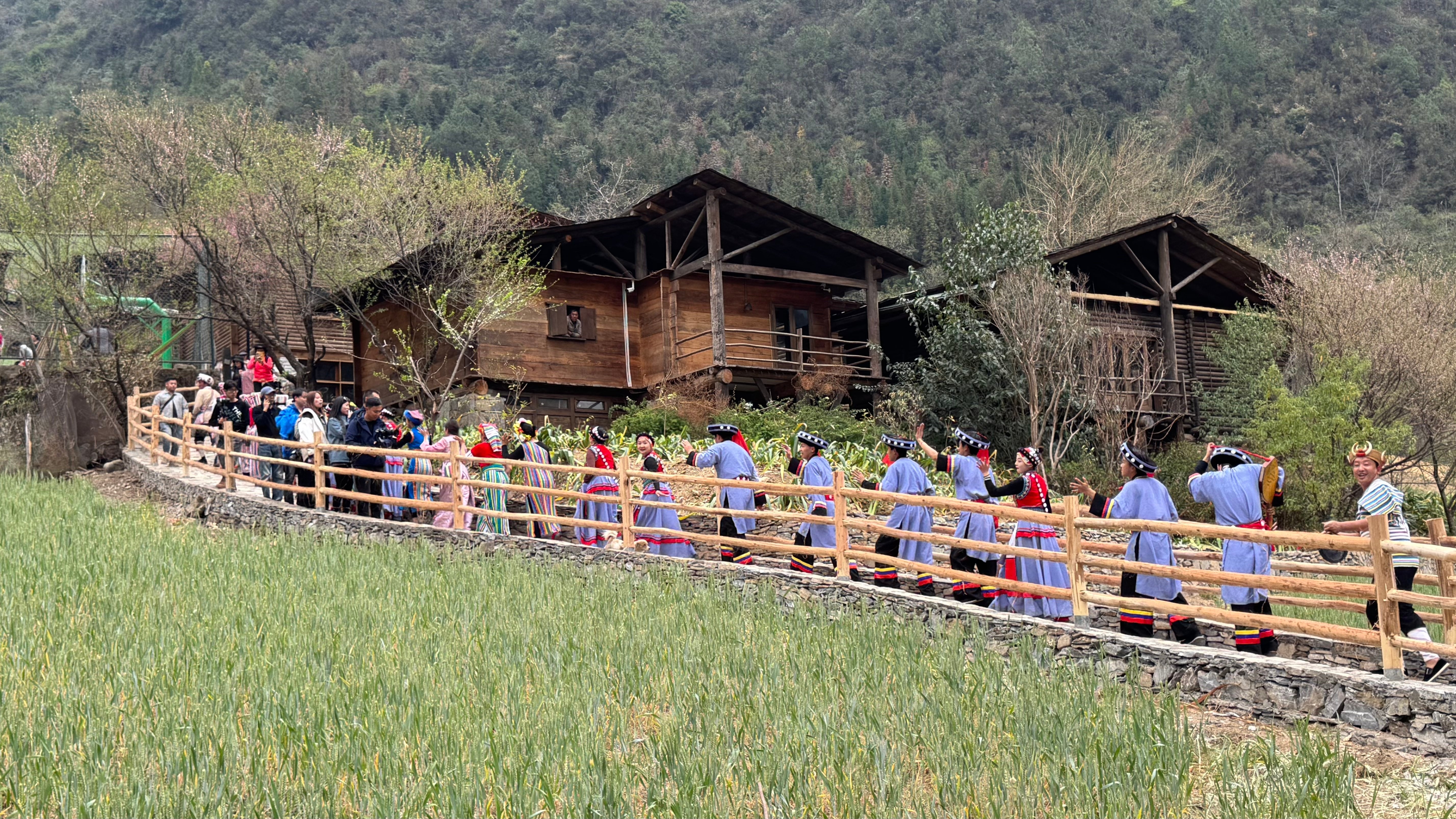 体验团穿行于原生态怒族村寨:传统民居木楞墙上的非遗纹样诉说岁月;穿戴怒族服饰体验织布技艺,木梭翻飞间,千年纺织智慧具象为掌心温度;酥油茶、石板粑粑的香气里,怒族同胞端起“峡啦”酒碗,婚俗展示中银饰叮当,滇藏界碑前,地理与人文的碰撞直击心灵。夜幕降临时,非遗表演点燃激情——弦子演奏悠扬,怒族哈达轻扬,各族游客手拉手跳起民族舞,火光映红的脸庞上,是对“人间烟火气”的共情。