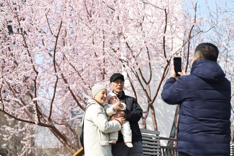 市民在花树下露出灿烂笑容,记录美好时刻。