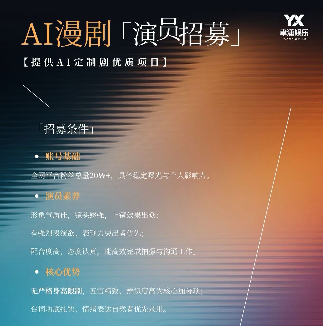 在招募进展方面,聿潇娱乐项目制片人表示,他们已与部分头部演员及网红建立接触。作为新兴事物,AI定制剧在初期确实面临艺人接受度不高的情况。现阶段,招募工作已步入正轨,当前的招募重点已转向更具针对性的高适配度演员。